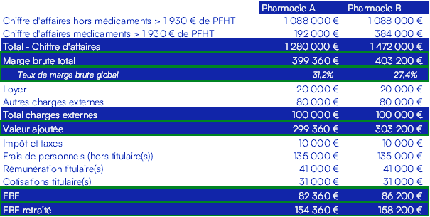 Ce tableau montre les indicateurs financiers entre deux officines ayant pour seule différence les volumes et types de médicaments chers.