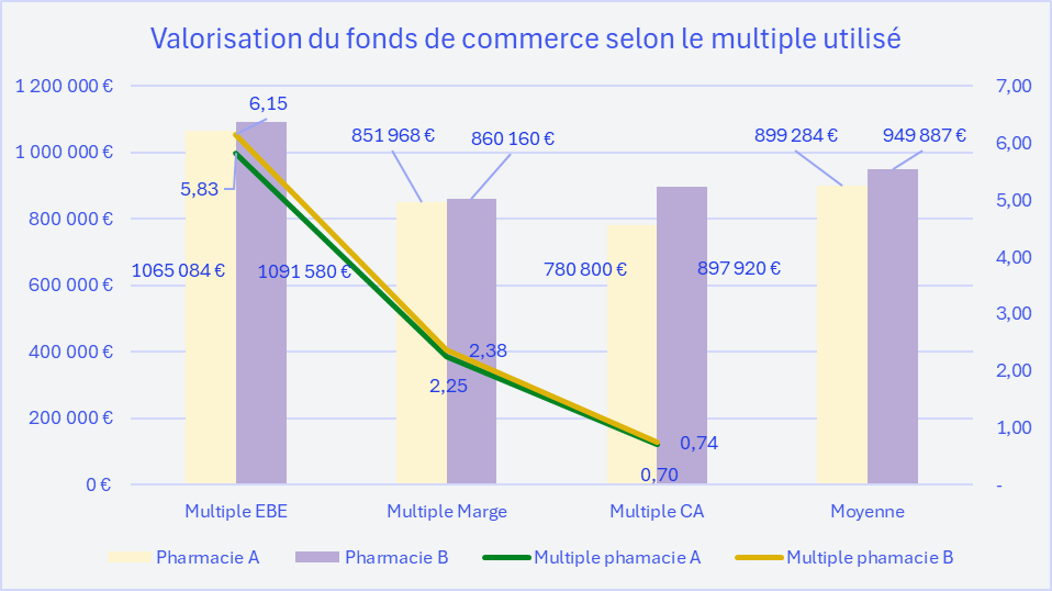 Ce graphique montre les valorisations du fonds de commerces des deux officines selon le multiple utilisé.